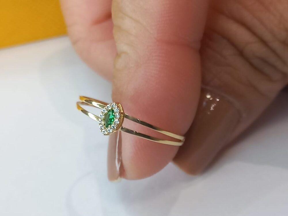 ANEL FEMININO, ESTILO FORMATURA, DELICADO, COM ZIRCÔNIA VERDE NAVETE, ARO 21, EM OURO AMARELO 18K