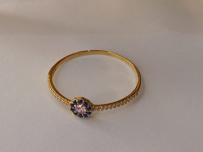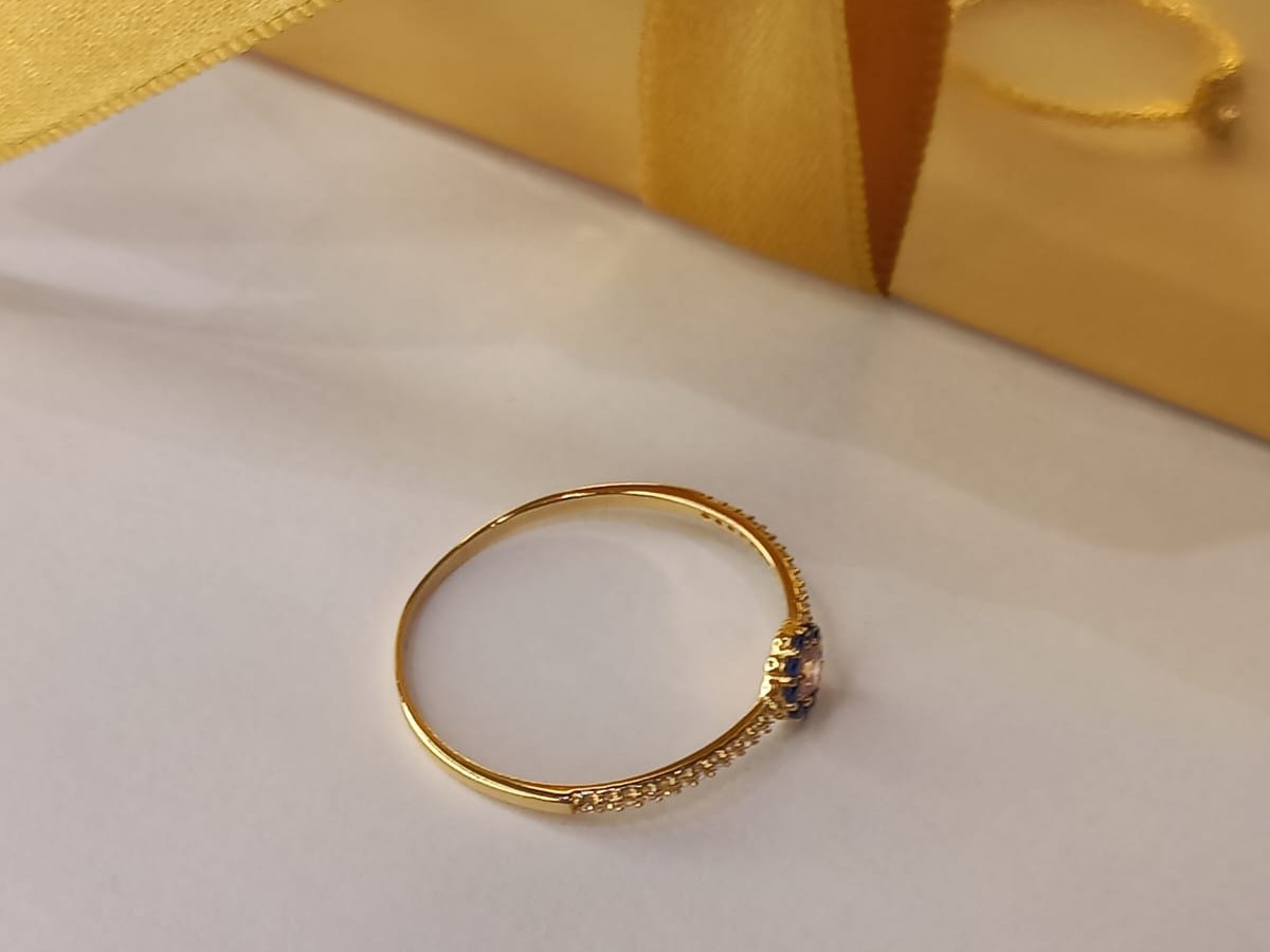 ANEL ESTILO FORMATURA COM PEDRA DE ZIRCÔNIA AZUL, ARO 21, EM OURO 18K