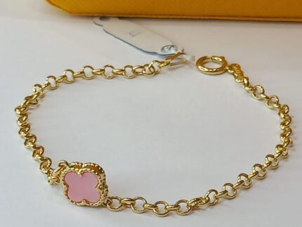 PULSEIRA ELOS PORTUGUÊS COM TREVO, PEDRA QUARTZO ROSA, 8.0MM X 19CM, EM OURO AMARELO 18K