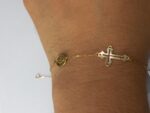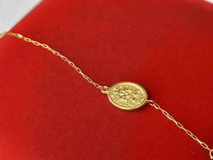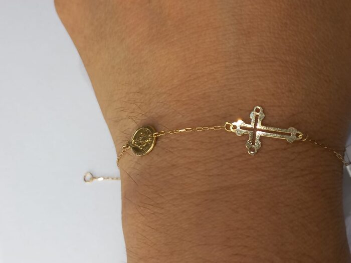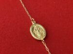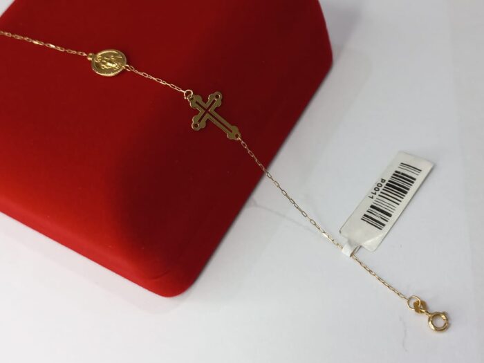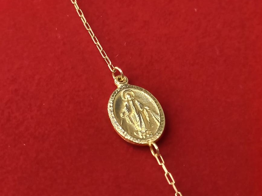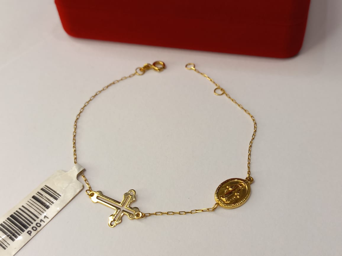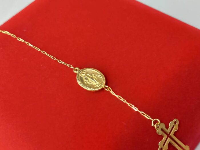 PULSEIRA RELIGIOSA, FEMININA, DELICADA, N. S. MILAGRES, MALHA FINA, MEDALHA DUPLA FACE, CRUZ VAZADA, 19CM, EM OURO AMARELO 18K